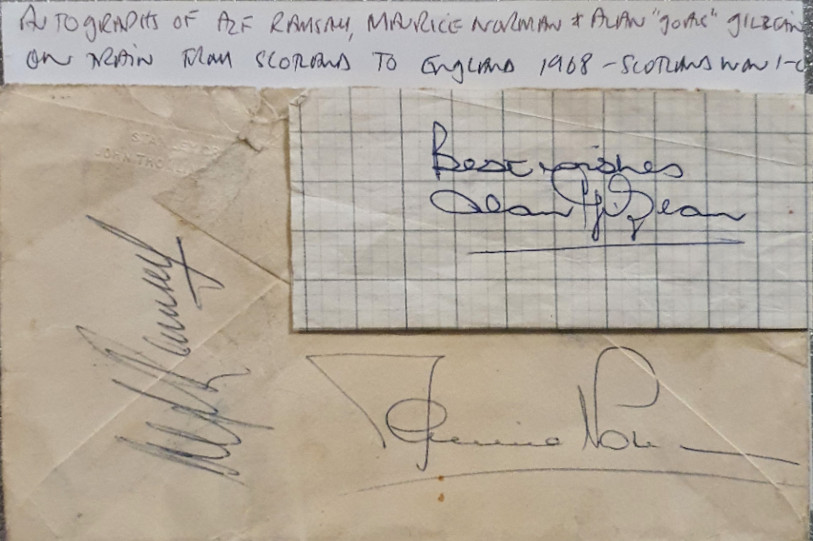 Having been lost for many years, Guy recently found Sir Alf's autograph but also the autographs of Maurice Norman (England) and Alan "Goals" Gilzean (Scotland).