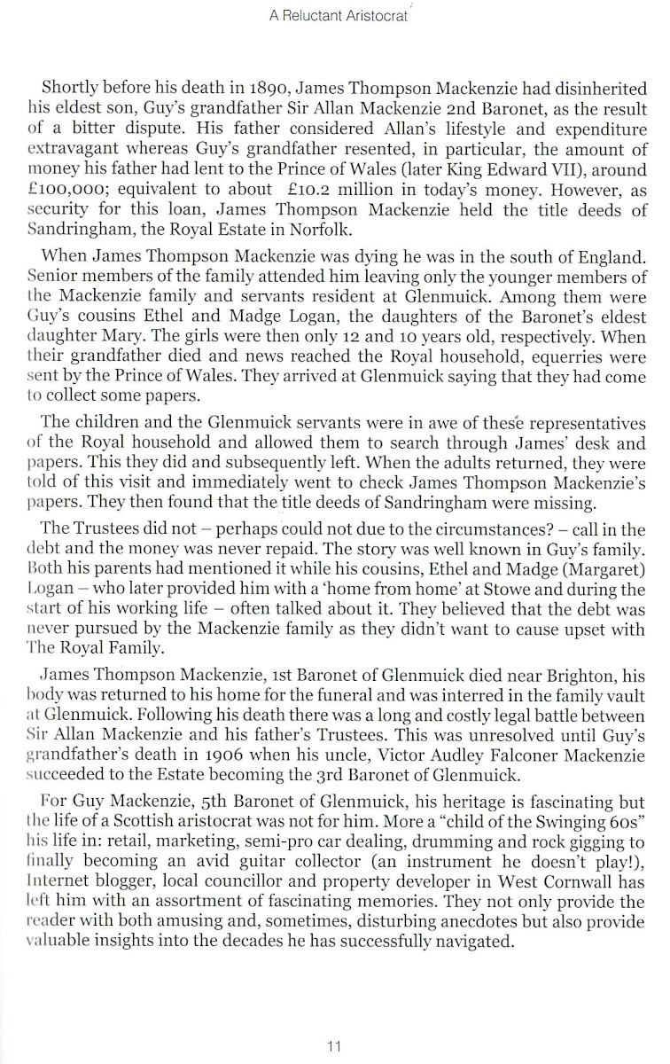On page 11 Guy tells that his great grandfather, James Thompson Mackenzie, lent the then Prince of Wales (later King Edward VII) about £100,000 secured on the deeds of Sandringham.