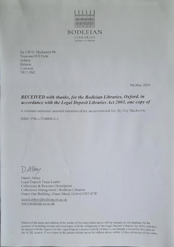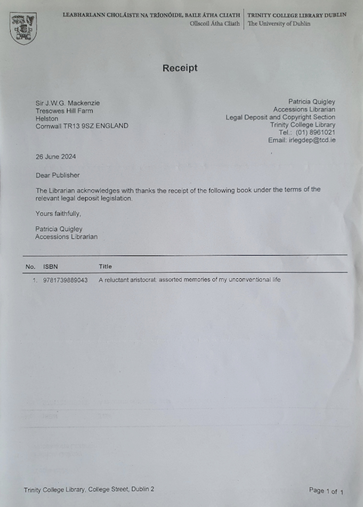 The A Reluctant Aristoctrat book has been published according to the Legal Deposits Libraries Act 2003. This means that you can now find my book at The British Library, The Library of Cambridge University, The National Library for Scotland, The National Library for Wales, The Bodlean Library, Oxford and Trinity College Library, Dublin.